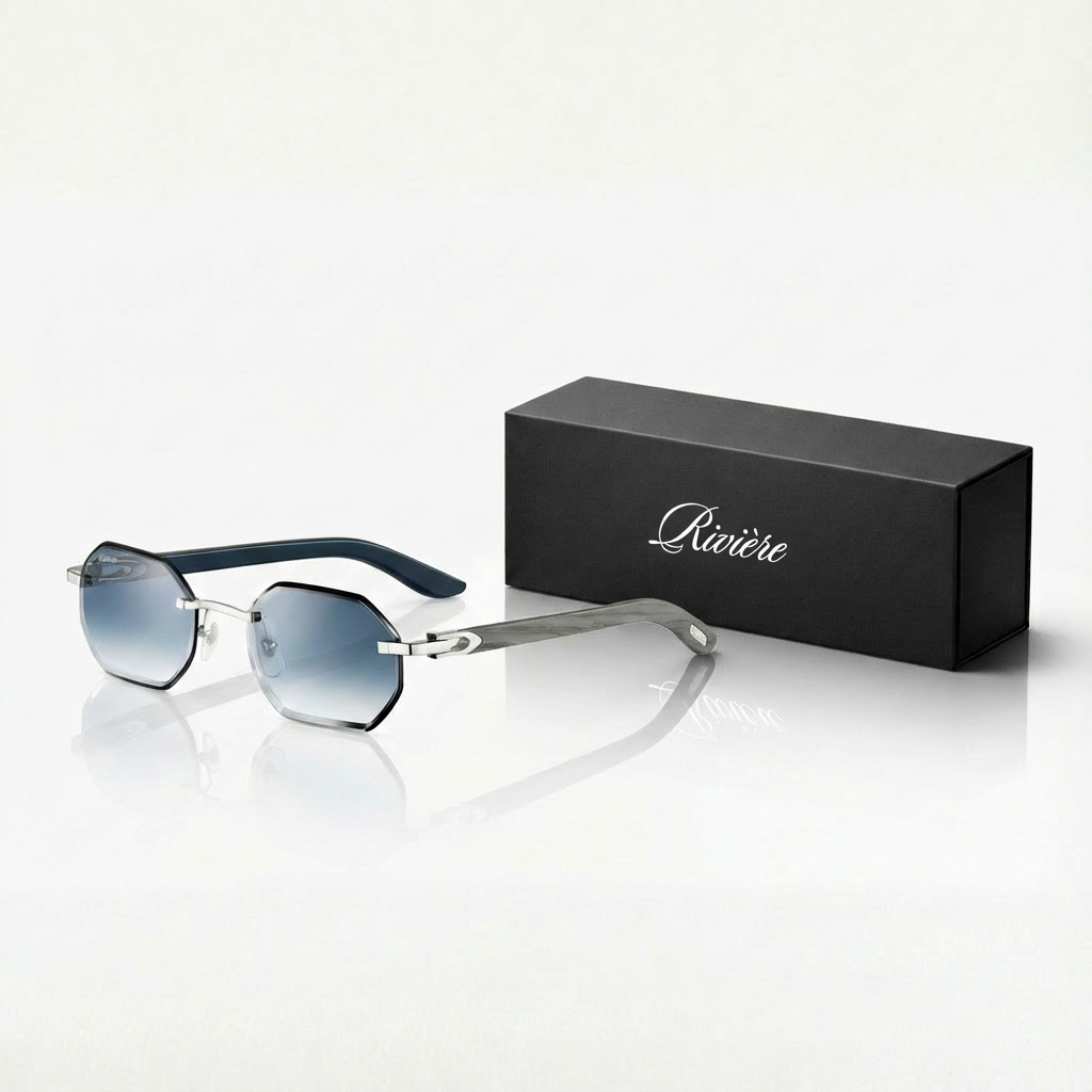 Rivière Rimless Sunglasses combine lightweight comfort with undeniable presence. Gradient blue lenses offer full UV protection while the 925 Sterling Silver-plated accents add a touch of luxury. Sleek, refined, and effortlessly stylish, these sunglasses are designed to turn heads wherever you go.