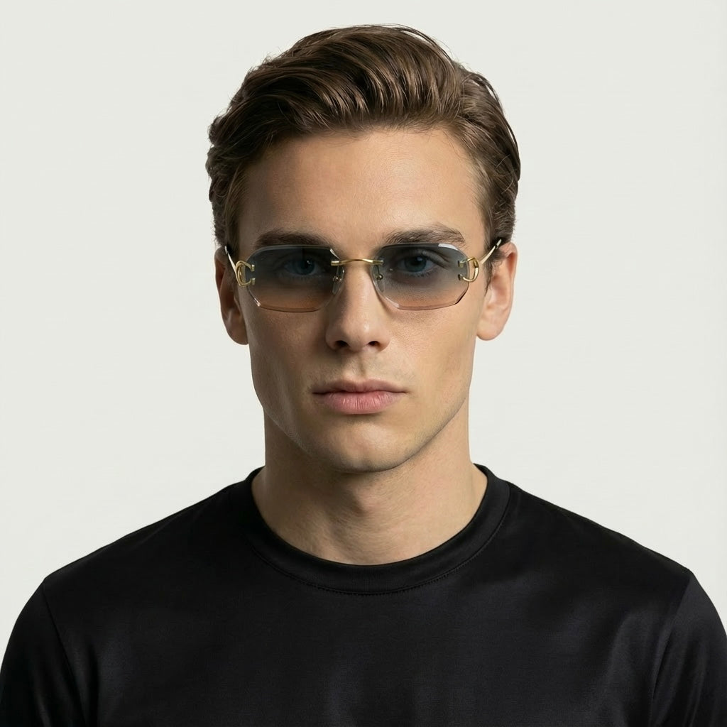 Rivière Rimless Sunglasses combine lightweight comfort with undeniable presence. Gradient blue lenses offer full UV protection while the 18k gold-plated accents add a touch of luxury. Sleek, refined, and effortlessly stylish, these sunglasses are designed to turn heads wherever you go.